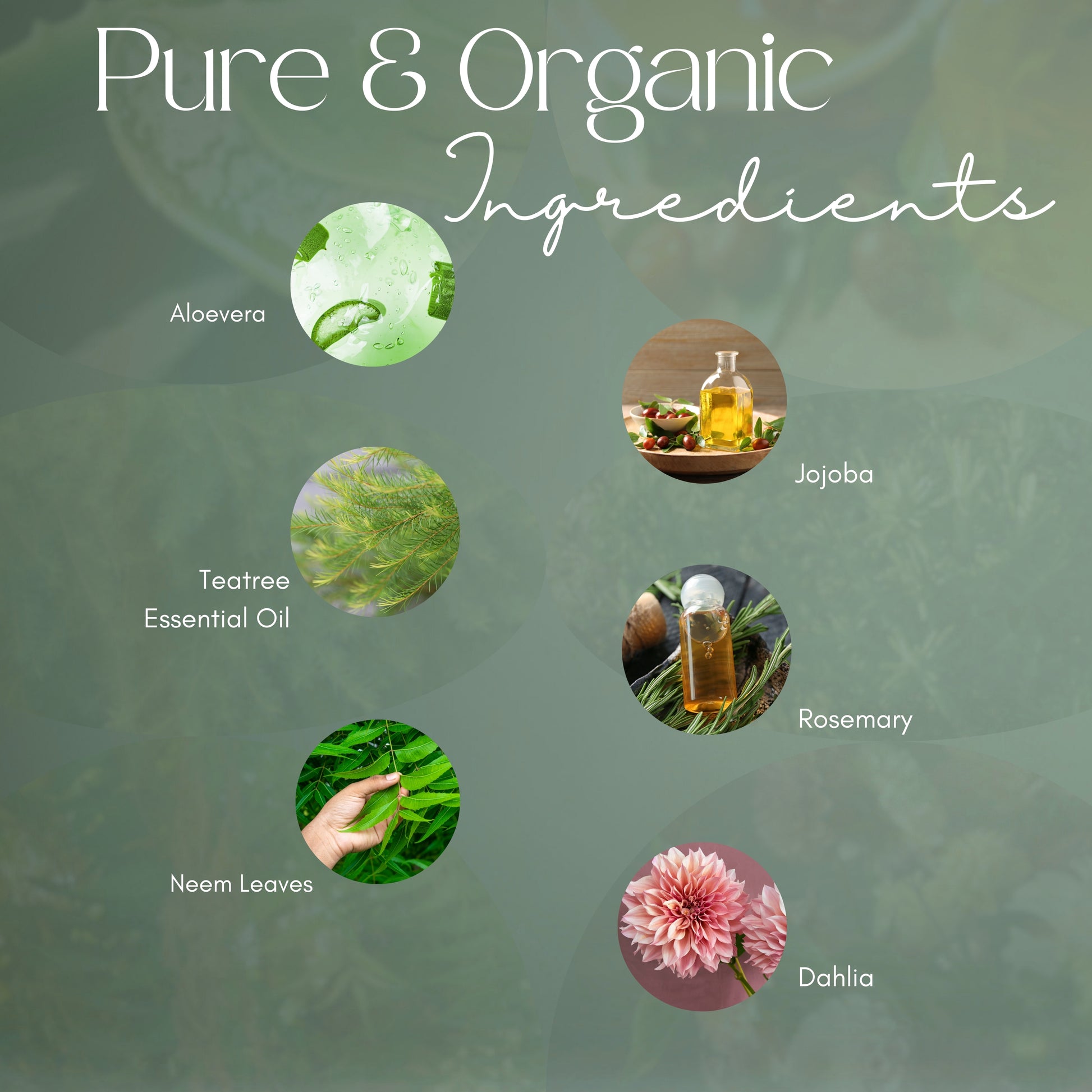 DM Water infused with bhringraj and neem leaves, jojoba oil infused with rosemary, sodium cocoyl isothionate, decyl glucoside, sensicare ( eco certified preservative ), lactic acid, organic aloevera juice, D penthenol, vit-E, glycerin, guar gum, coco betain, dahlia and teatree essential oil